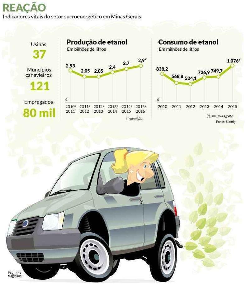 Com a conquista tão esperada dentro do estado, está confirmada a meta de produção também sem precedentes de 3 bilhões de litros de álcool anidro e hidratado, com expansão da cana-de-açúcar destinada às usinas em apenas 1,5 milhão de toneladas, estima o presidente dA Siamig, Mário Campos. Em 2014, as usinas mineiras produziram 2,7 bilhões de litros de etanol. Nos primeiros oito meses do ano passado, a demanda atendida em Minas limitou-se a 466,99 milhões de litros.