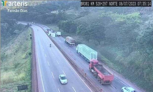Um acidente envolvendo uma carreta fechou a pista da BR-381, em Brumadinho, Região Central de Minas, na manhã desta quinta-feira (6/7).