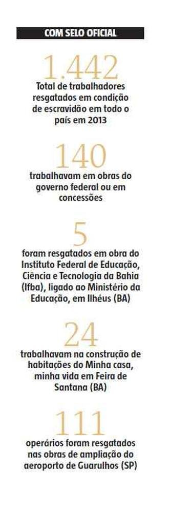 Em Ilhéus (BA), os fiscais do MTE encontraram operários em condições análogas à escravidão em alojamentos dentro do canteiro de obras do Instituto Federal de Educação, Ciência e Tecnologia da Bahia (Ifba), ligado ao Ministério da Educação. Cinco operários foram resgatados em abril. No barraco em que estavam, não havia portas, camas ou água. Além das condições degradantes, auditores verificaram o descumprimento de uma série de medidas de segurança obrigatórias no ramo da construção civil.