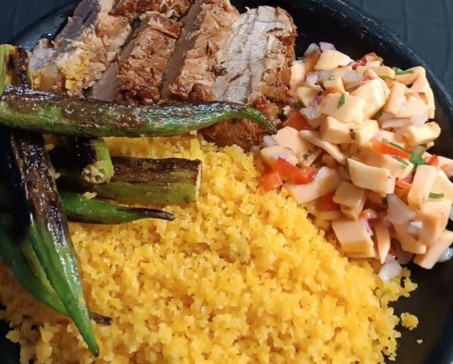 Outro destaque da casa é o Xinxim de Frango (R$ 49,90), composto por filé de frango ao molho de leite de coco e amendoim, acaçá, arroz, salada de feijão fradinho e farofa de dendê.