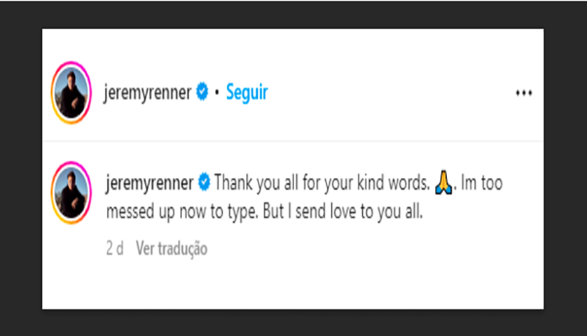 Na época da internação, Jeremy Renner publicou uma mensagem nas redes sociais agradecendo pelo apoio dos fãs, que acompanhavam seu dia a dia pelas publicações Foto: Reprodução rede social -