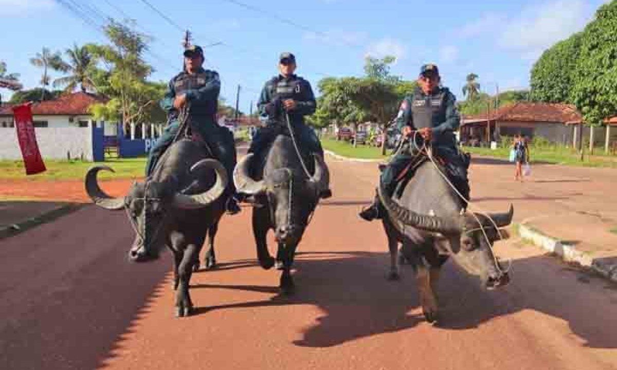 A unidade, vinculada ao Comando de Policiamento XI (CPR XI) - 8º BPM, portanto, realiza o policiamento montado em búfalos, animal símbolo cultural da região. Foto: Paulo Lobato -