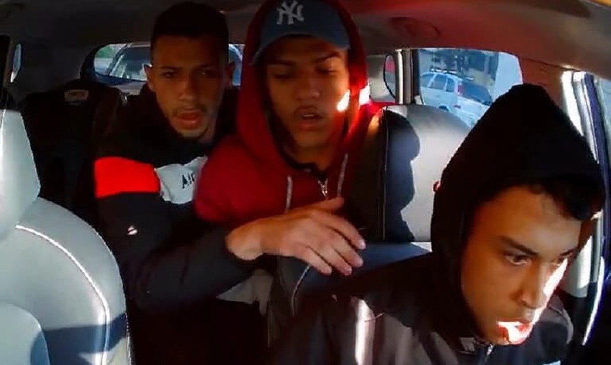 O assalto foi no Sacomã, na zona sul da capital paulista. Um motorista de aplicativo teve que entregar o carro e, já no começo, os bandidos se atrapalharam para ligar o veículo. Depois, ao perceber a câmera, um deles tenta quebrar o equipamento,mas quebra o retrovisor e os outros o repreendem. Uns discutem com os outros, numa cena que viralizou. Foto: Reprodução câmera de segurança -