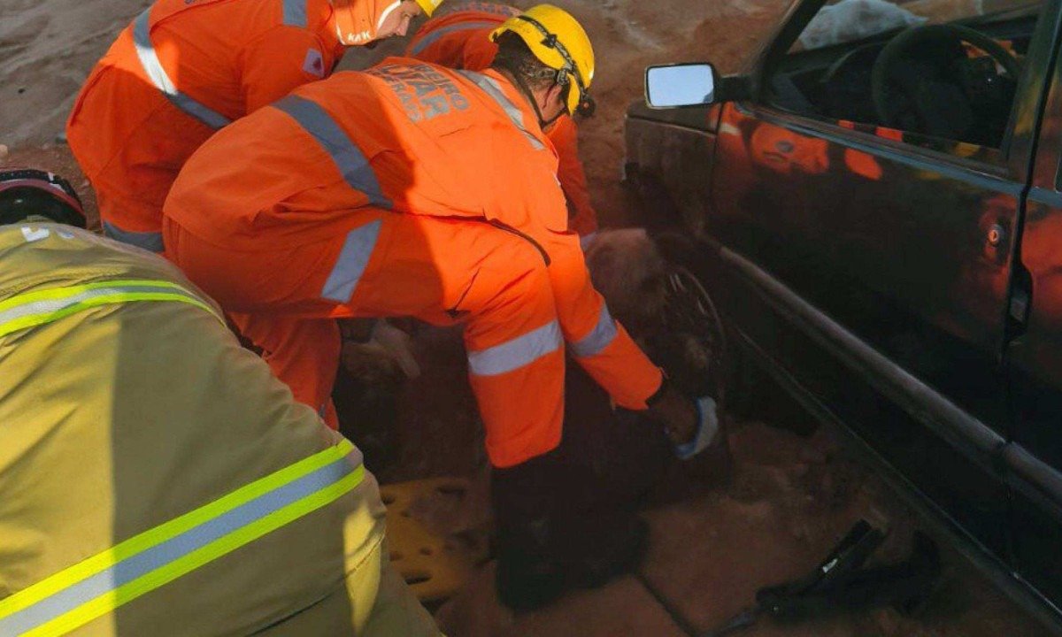 Idoso bate o carro e quase sufoca preso a veículo em meio a terra de obra
