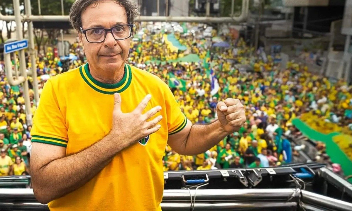 Nas imagens, Machado aparece abordando e entregando adesivos com mensagens de apoio ao filho do ex-presidente. O ex-ministro, que também presidiu a Embratur durante o governo Bolsonaro, circula pelo público enquanto divulga o material.
