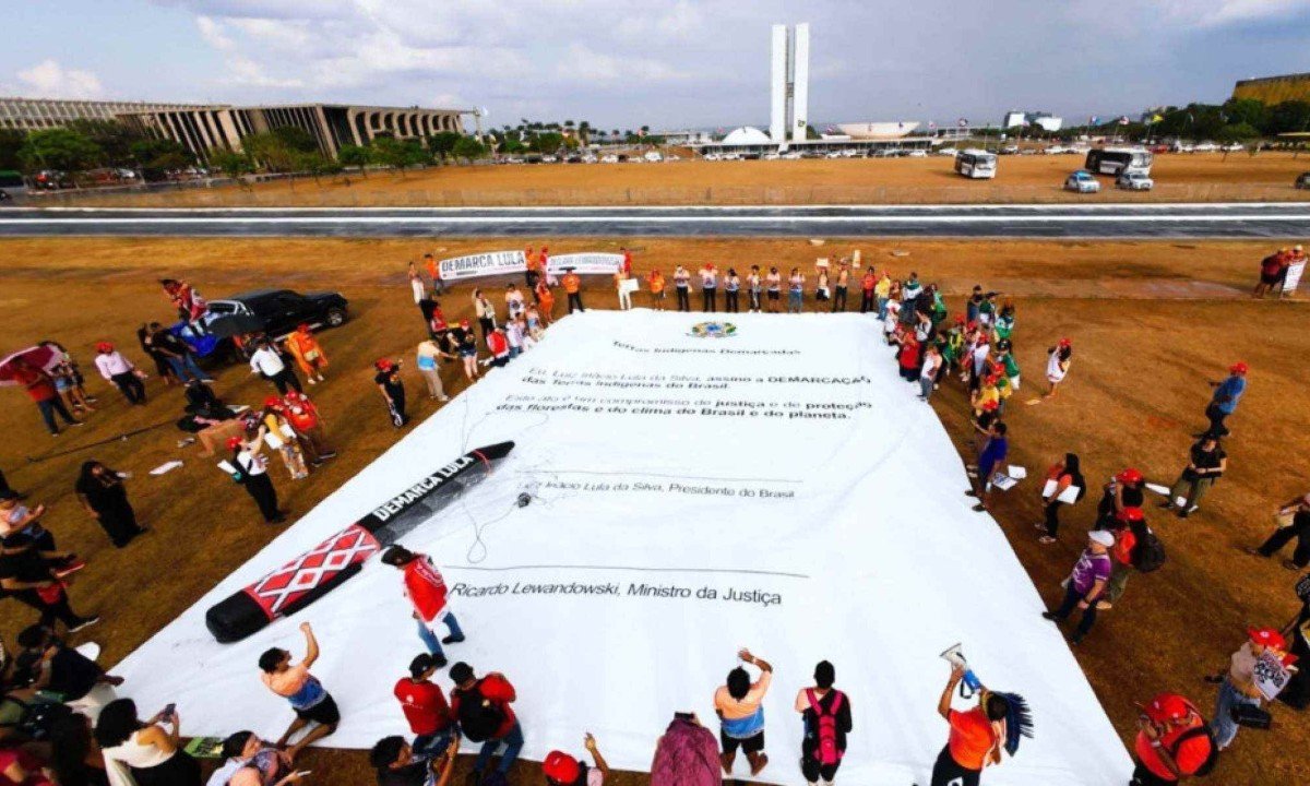 Os manifestantes levaram um documento gigante e uma caneta inflável de 5 metros para a Esplanada dos Ministérios. Na caneta, está escrito “Demarca Lula”, mote da campanha. No documento, constam espaços de assinatura para os nomes do presidente e do ministro da Justiça. Dos 104 processos, 67 dependem de Lula e 37, de Lewandowski.