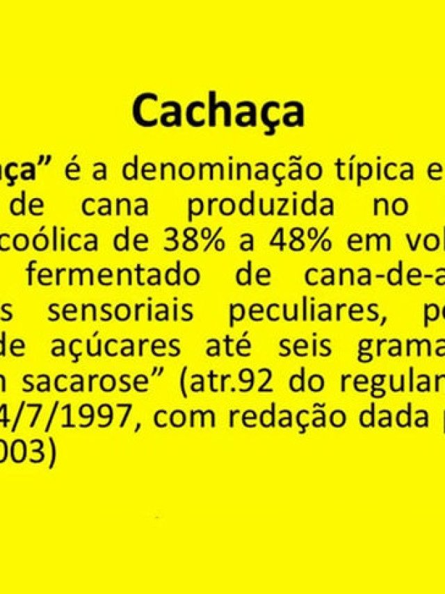 Diz a lei: 'Cachaça é a denominação típica e exclusiva da aguardente de cana produzida no Brasil, com graduação alcoólica de 38% a 48% em volume, a 20°C), obtida pela destilação do mosto fermentado de cana-de-açúcar com características sensoriais peculiares, podendo ser adicionada de açúcares até seis gramas por litro, expressos em sacarose'