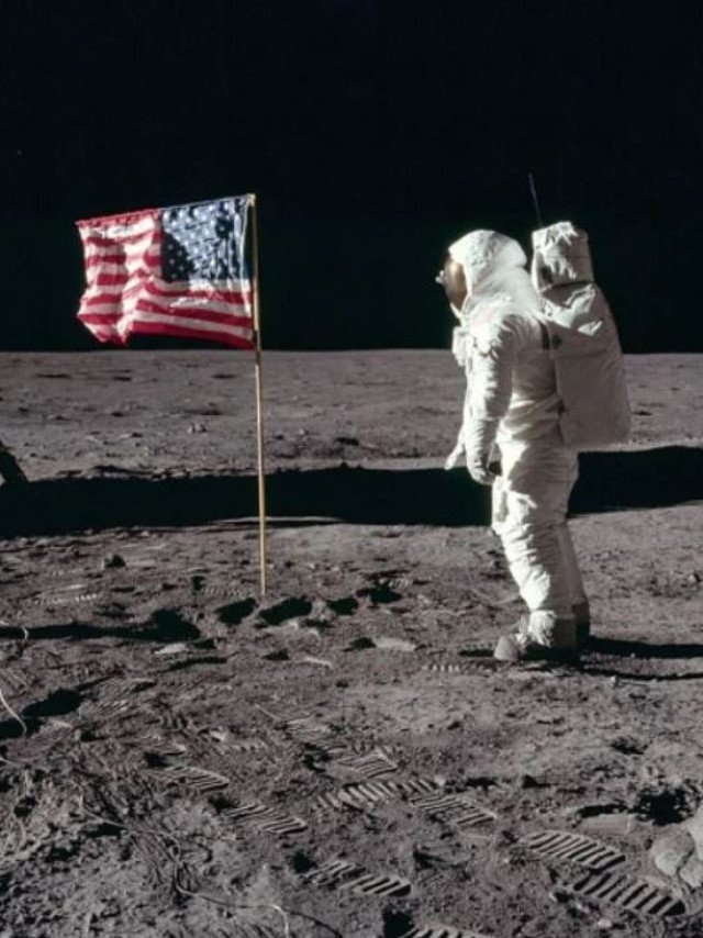 Nessa foto, Buzz Aldrin aparece diante da bandeira dos Estados Unidos, fincada na Lua — Michael Collins foi o único que não saiu da nave.