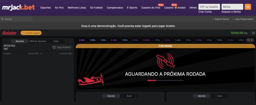 Para começar a jogar Aviator, basta abrir uma conta na Mr Jack Bet Casino e em seguida depositar fundos. Ao selecionar o crash game, minha dica é que você teste a versão demonstrativa antes de apostar com dinheiro real.