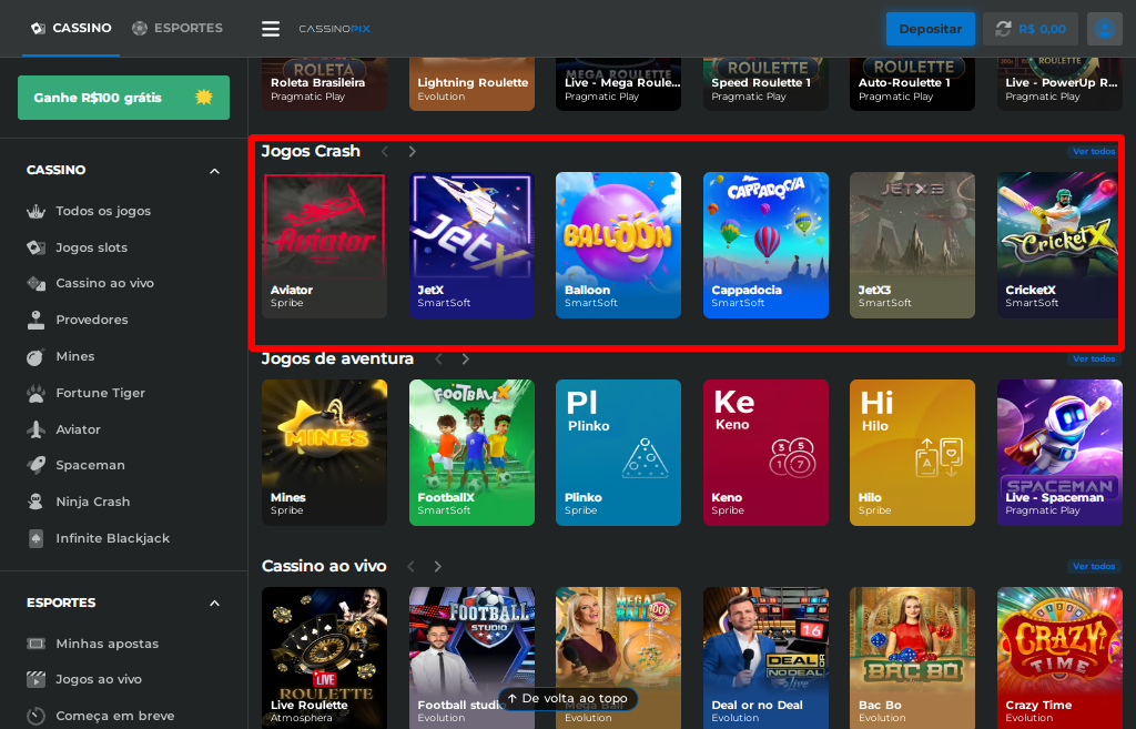 Na página inicial do cassino, há um menu destacado para a seção de crash, com ainda mais títulos legais, como JetX, Balloon, Footbal X, Plinko, entre outros.