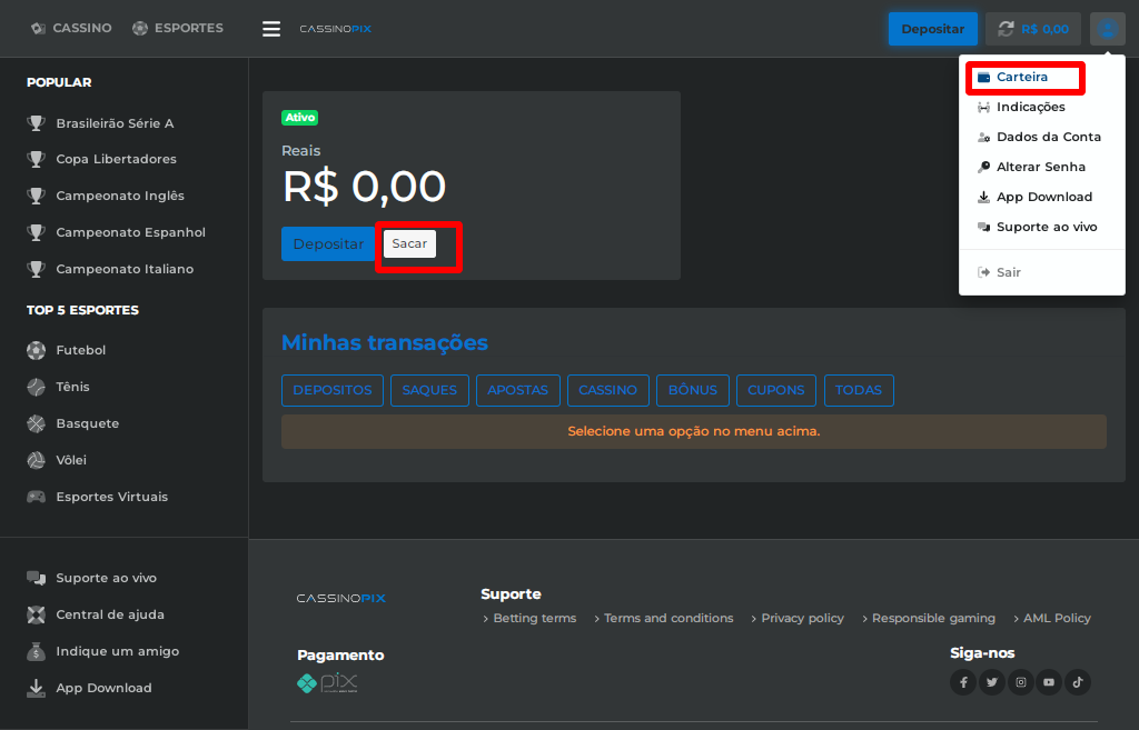 Como posso depositar dinheiro na minha conta no CassinoPix?