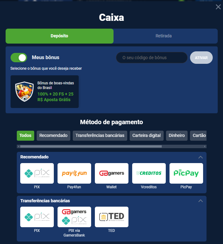 Para depositar é bem fácil. O jogador precisa cumprir os seguintes passos: