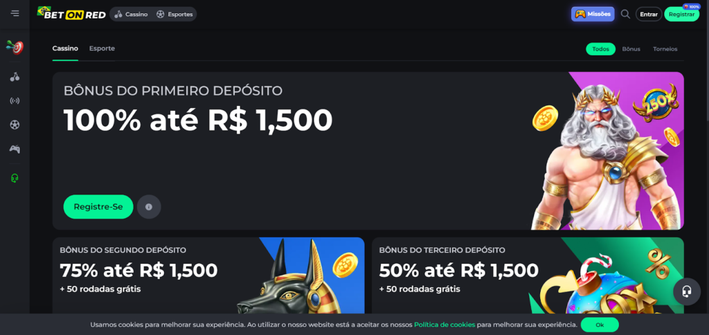 A oferta do cassino BetOnRed é de até R$ 4.500 e esse valor pode ser obtido ao longo dos 3 primeiros depósitos que você realizar nesse site. Além disso, novos clientes podem obter até 100 giros grátis durante o 2º e 3º depósitos.