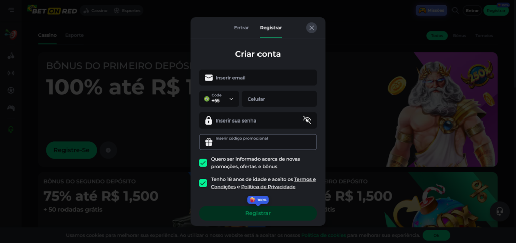 Não se preocupe com o código promocional BetOnRed para ativar essa promoção. Ela é ativada sem cupons promocionais. É necessário apenas a seleção dessa vantagem quando você realizar o seu 1º depósito.