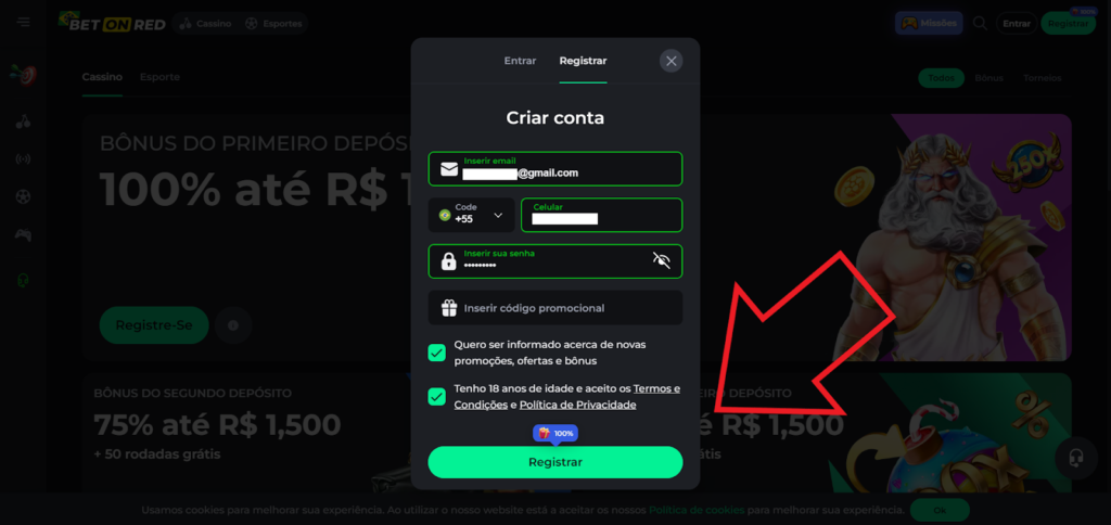 - Preencha as informações e pode ignorar o campo do código promocional BetOnRed, inserindo o código