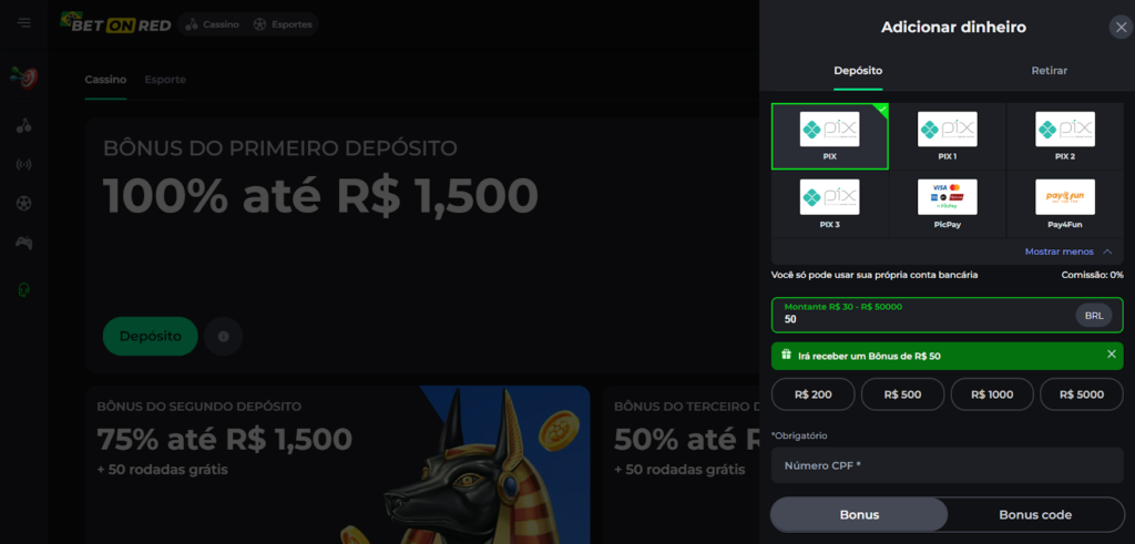 Você perceberá que é no momento do seu 1º depósito que será possível ativar o bônus de boas-vindas de sua preferência. As opções aparecerão logo após o montante. Tenha em mente que o código promocional BetOnRed pode ser inserido no depósito.