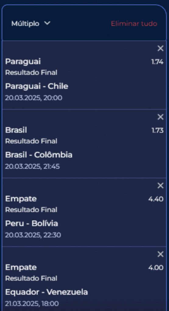 Já para a aposta múltipla com seleções vencedoras, exige-se 4 mercados ou mais sem restrição de odds.