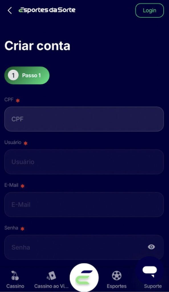 O bônus da Esportes da Sorte Cassino está disponível apenas para novos jogadores com mais de 18 anos. Se você quer reivindicar a oferta, o primeiro passo é criar a sua conta na casa.