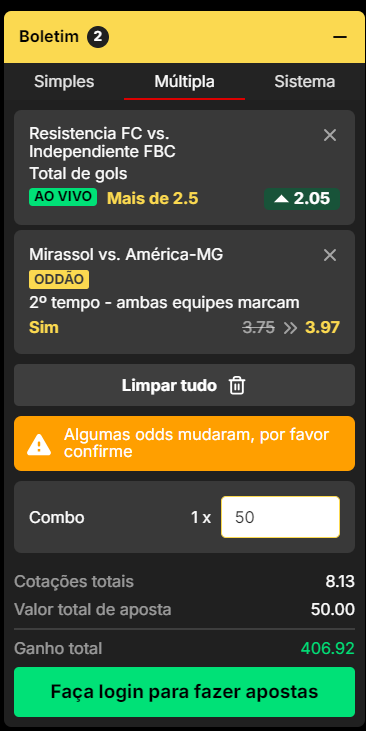 Insira o valor que deseja apostar em cada seleção e observe como as odds são atualizadas automaticamente para refletir o potencial retorno da aposta.