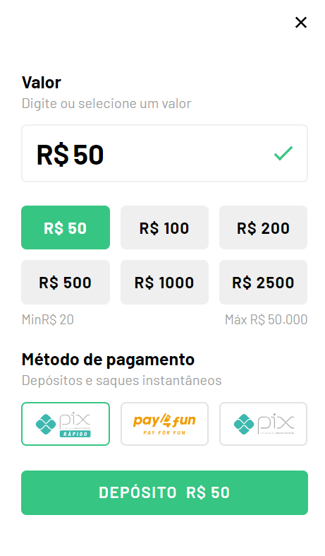 - Limites: O Pay4Fun permite depósitos com valor mínimo de R$ 20 e máximo de R$ 30 mil, o que facilita para os apostadores com diferentes tamanhos de banca.