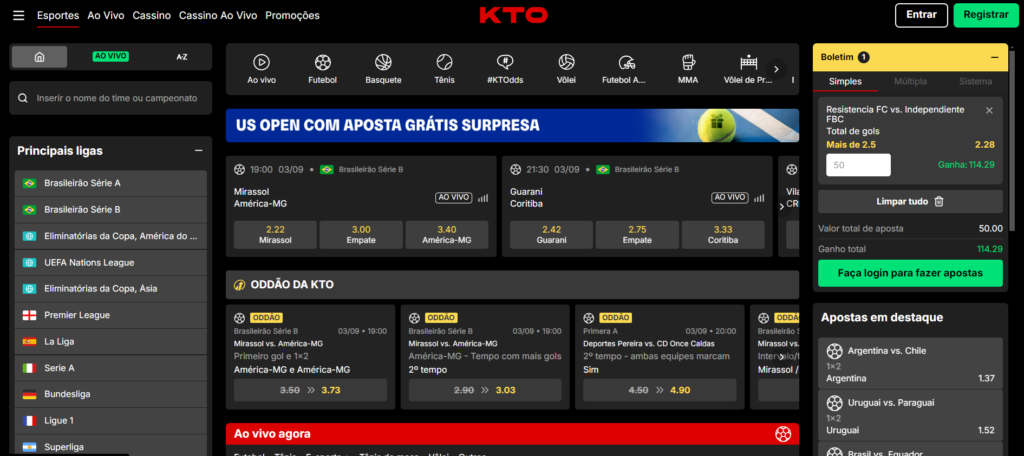 O futebol é o esporte mais popular para apostas na KTO Brasil. A plataforma oferece uma cobertura abrangente de ligas internacionais e competições locais, incluindo Brasileirão, Libertadores, Copa Brasil, campeonatos estaduais, Premier League, La Liga, Serie A, Bundesliga, Ligue 1, UEFA Champions League, entre outros.