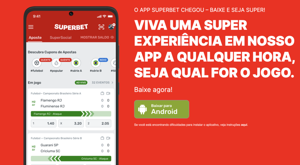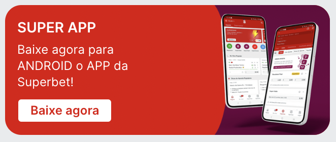 Para baixar o app da Superbet, você deve acessar o site pelo seu smartphone e clicar no campo “Super Aplicativo”, localizado nos banners promocionais de fundo vermelho. Em seguida, aperte “Baixar para Android“ e autorize a instalação.