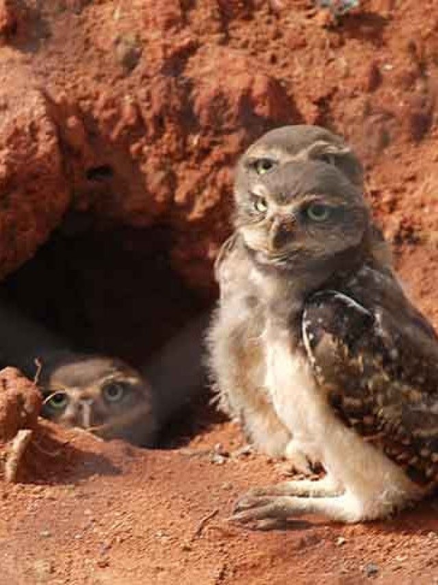 Coruja-buraqueira (Athene cunicularia): Em vez de construir ninhos em árvores, essa coruja cava buracos no chão para criar seu lar. Ela também se apropria de tocas abandonadas de outros animais, como tatus, e costuma decorar a entrada com esterco para atrair insetos que ela come.