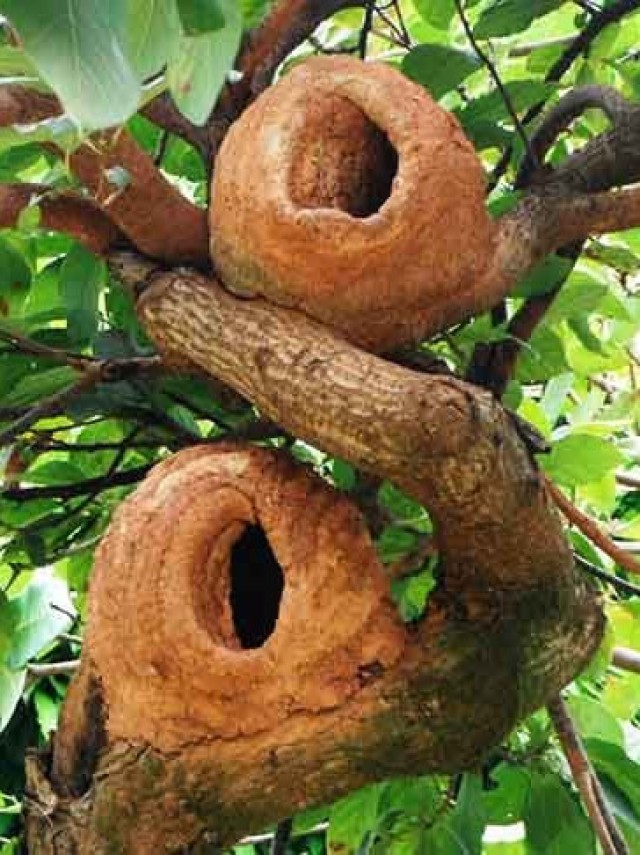 Formiga tecelã (Oecophylla smaragdina): Elas criam ninhos suspensos em árvores, unindo folhas usando um 'fio de seda' que suas larvas produzem, formando estruturas que podem abranger várias folhas, como pequenos condomínios.