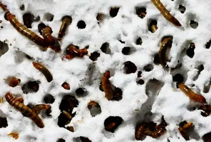 De acordo com os cientistas, a larva-da-farinha (de tenébrios) pode mastigar o poliestireno e hospedar bactérias em seus intestinos que ajudam a quebrar o material.