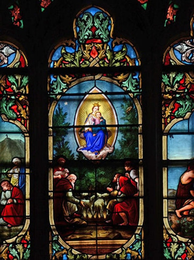 Vitrais - Grandes janelas de vitrais com histórias bíblicas ou figuras de santos são comuns. Estes vitrais não só têm uma função decorativa, como também permitem a entrada de luz colorida, criando um ambiente espiritual.