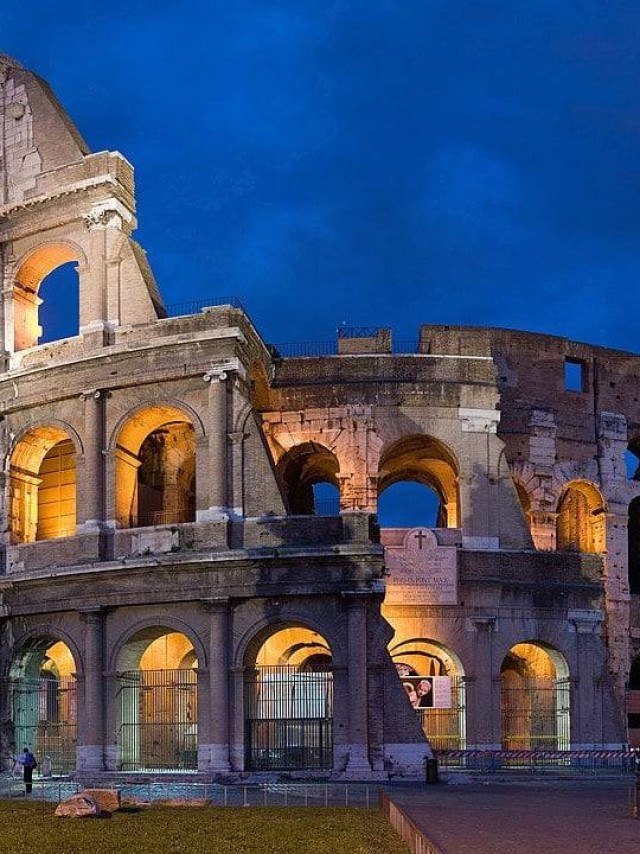 Coliseu - Roma - Itália. Finalizado em 80 d.C., o Coliseu tornou-se o maior anfiteatro da Roma antiga, acomodando entre 50.000 e 80.000 espectadores. Sua construção, em formato oval, foi projetada para eventos públicos, como combates de gladiadores. Reconhecido como Patrimônio Mundial da UNESCO, o Coliseu continua a ser um ícone significativo da Roma antiga.