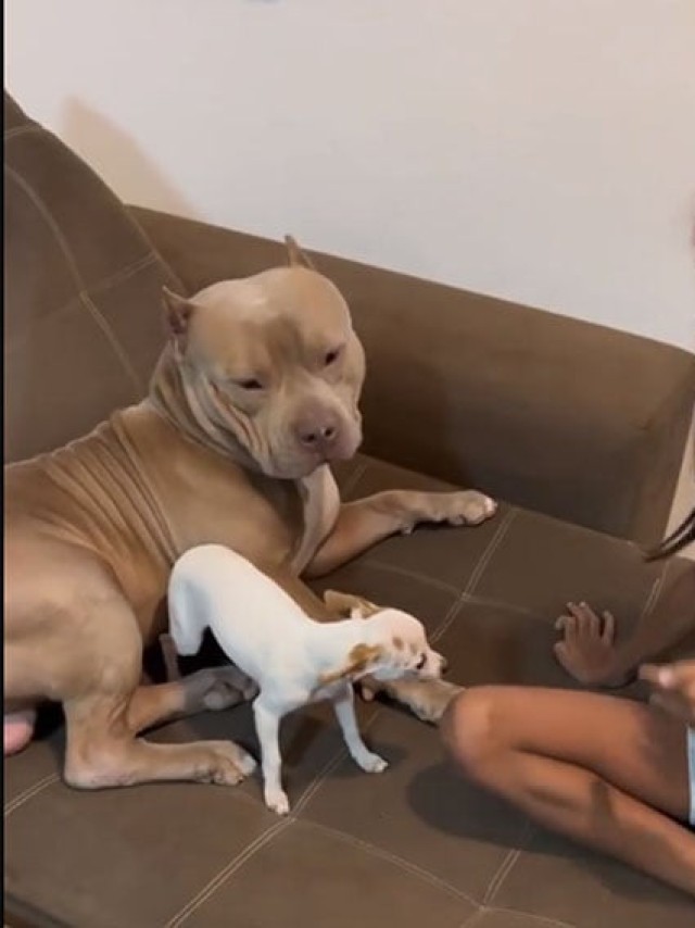 Paçoca chega a latir e 'mostrar os dentes' para a tutora, mostrando contrariedade à relação entre ela e o pacífico pitbull.