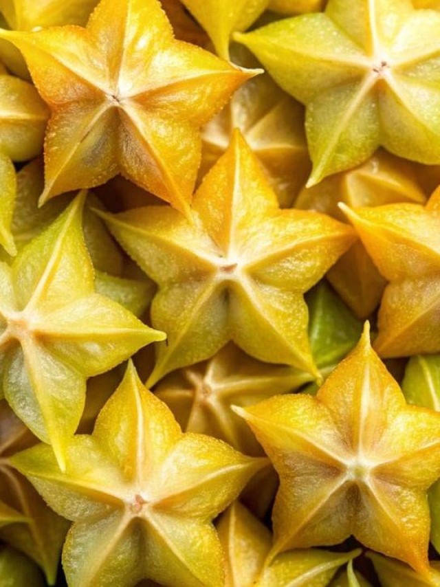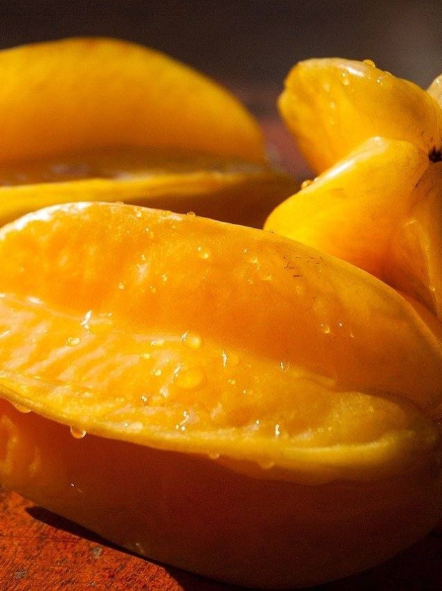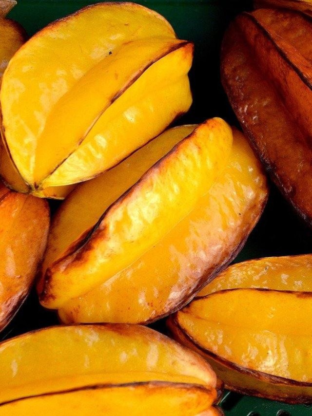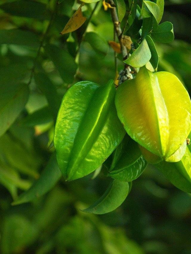 A fruta comestível tem cristas distintas descendo pelos lados (geralmente cinco ou seis). Quando cortada em seção transversal, ela assemelha-se a uma estrela, dando-lhe o nome de fruta-estrela.
