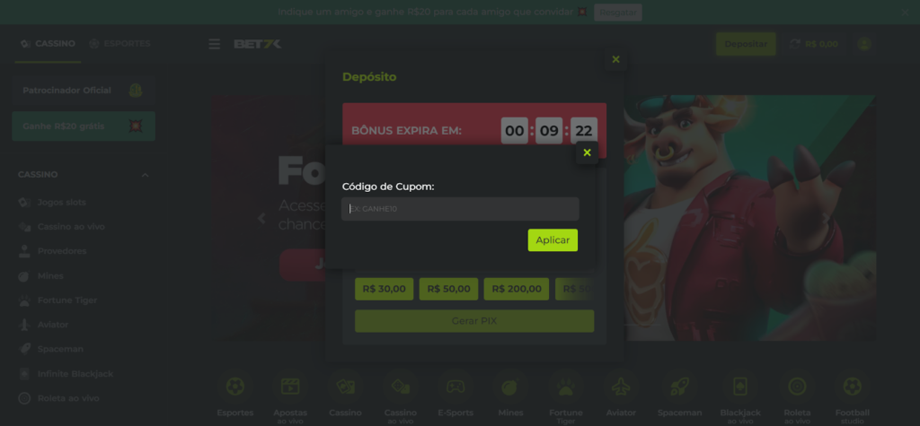 Atenção, porque é durante o depósito que você deverá ativar seu código promocional Bet7k.