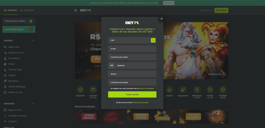 Passo a passo para se cadastrar no cassino Bet7k