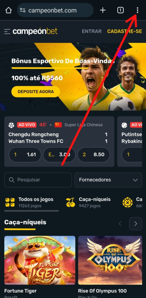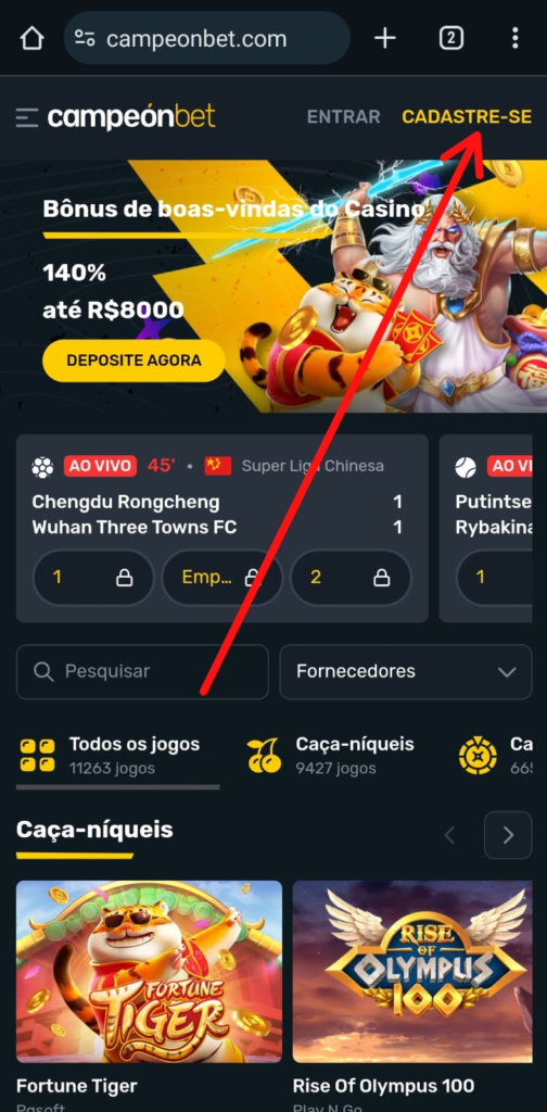 Para se registrar utilizando a versão genérica do Campeonbet app, você só precisa acessar este review pelo celular e tocar em qualquer um dos banners presentes nessa página para ser redirecionado de maneira mais rápida ao site Campeonbet e dessa forma criar o atalho do mesmo no seu celular. Tendo feito isso, toque em “Cadastre-se”: