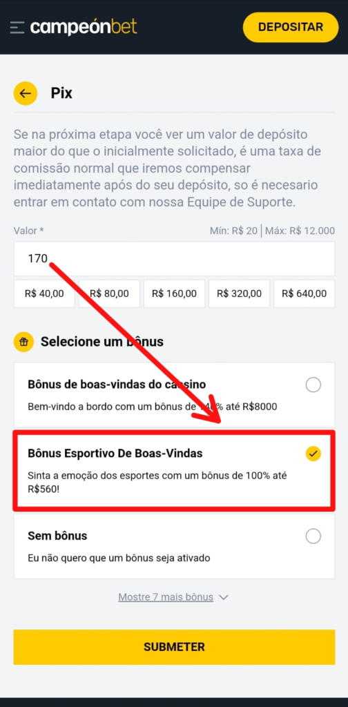 Vale lembrar que a ativação do bônus só é completada na hora de realizar o primeiro depósito, onde você precisará indicar na seção “Selecione um Bônus” qual dos 9 bônus oferecidos pela Campeonbet você deseja: