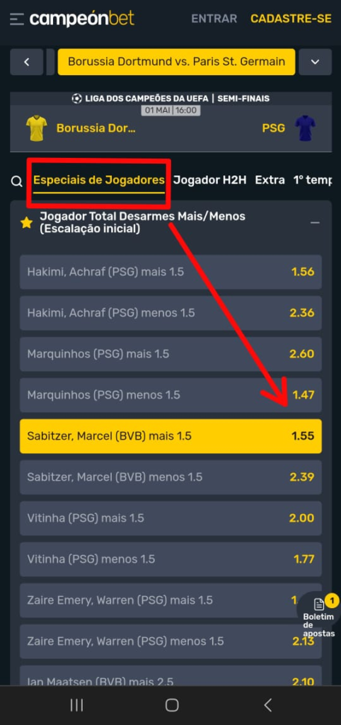 Oportunidades como a que encontramos na partida entre Borussia Dortmund x PSG. Mais precisamente no mercado de desarmes e mais especificamente para o Marcel Sabitzer, meio-campista austríaco do Borussia, ter acima de 1,5 desarmes no jogo, pagando uma cotação de @1.55 na Campeonbet: