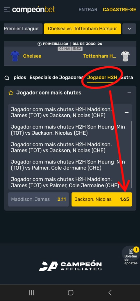 Outra odd EV+ localizamos no duelo entre Chelsea x Tottenham. Mais precisamente no mercado Jogador H2H e mais especificamente para o Nicolas Jackson, atacante dos Blues, ter mais chutes totais do que o James Maddison, meio-campista dos Spurs, pagando uma cotação de @1.65 na Campeonbet: