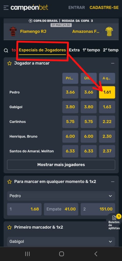Mais precisamente na partida entre Flamengo x Amazonas, onde encontramos uma oportunidade valiosa no mercado de especiais de jogadores. Mais especificamente para o Pedro, atacante do Fla, marcar um gol a qualquer momento, pagando uma cotação de @1.61 na Campeonbet: