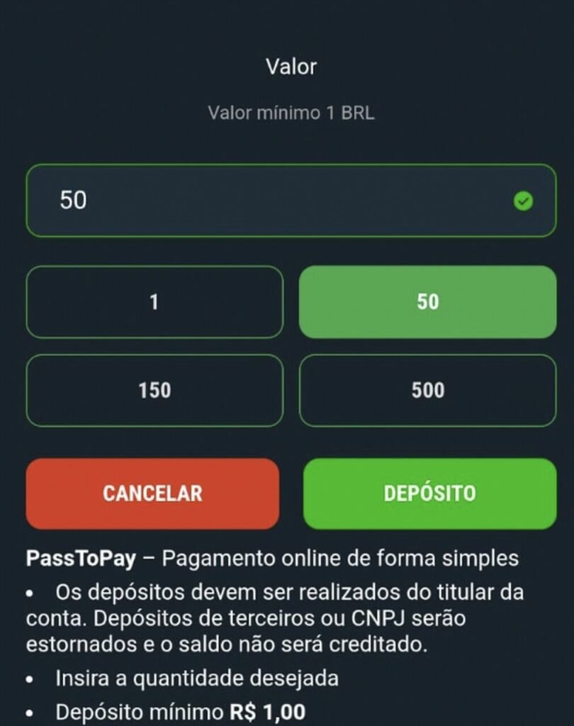 O depósito mínimo na Meridianbet é de R$ 1 via Pix com o PassPay. Basta acessar sua conta, clicar em “depósito”, inserir o valor desejado e confirmar usando QR Code ou código Pix Copia e Cola.
