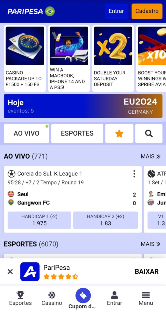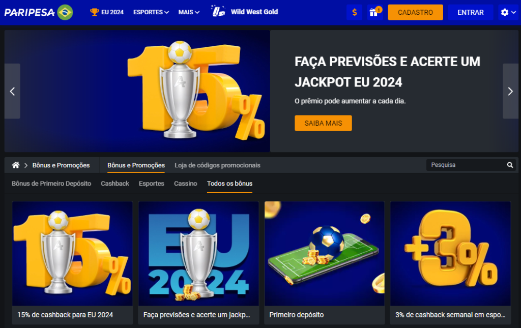 O código promocional Paripesa é EMVIP e pode ser inserido na criação da conta ou na página de “bônus e presentes”, no menu da conta. O cupom dura por tempo limitado, então é importante reivindicá-lo rapidamente.