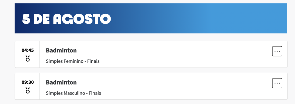 O calendário de badminton para os Jogos Olímpicos de 2024 já está a todo vapor, então não faltam oportunidades para apostar tanto nas categorias masculinas e femininas quanto nas mistas. Acompanhe a programação completa abaixo: