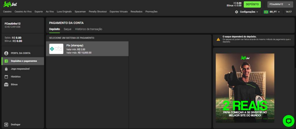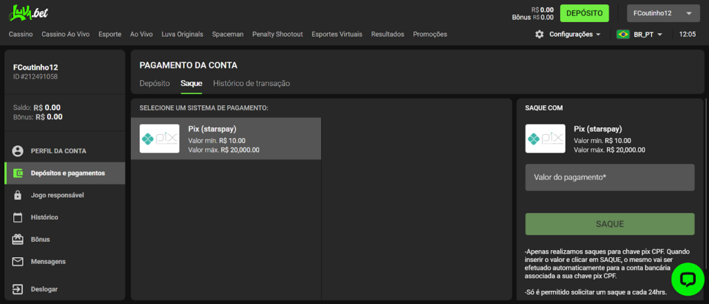 Antes de sacar, vale lembrar: a Luvabet aplica um rollover de 50% sobre qualquer depósito e exige que o jogador mantenha um saldo remanescente na conta. Ou seja, se você depositar R$10, precisa apostar pelo menos R$5 antes de solicitar o saque — e ainda ter um valor disponível na conta ao final.