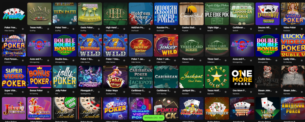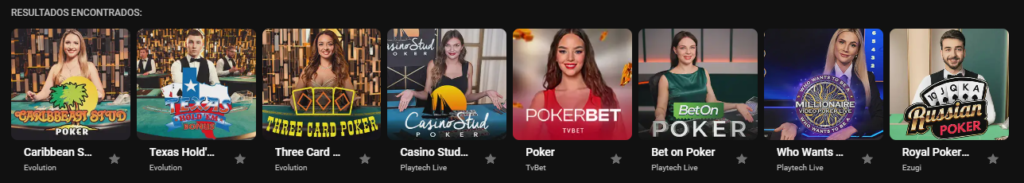 - Caribbean Stud Poker: um dos formatos mais populares de pôquer, com apostas de ante, raise e bônus lateral.
