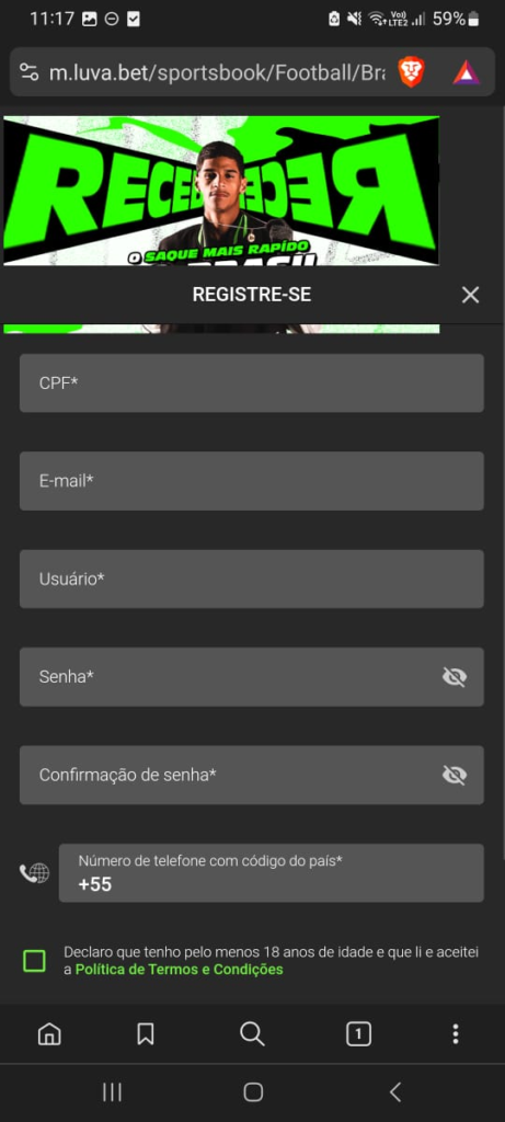 - Acesse a Luva Bet Brasil pelo nosso banner seguro e crie a sua conta;