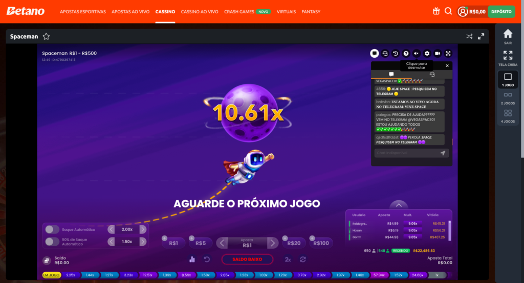 - Sala de bate-papo: é possível manter contato direto com outros jogadores de Spaceman, que estão online em tempo real na sala de apostas da Betano. No canto da tela, os apostadores podem ativar o bate-papo e compartilhar com outros usuários todas as emoções de cada uma das rodadas do jogo do astronauta.