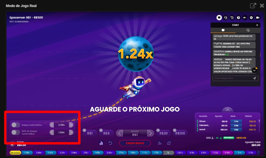 Assim que o astronauta chegar a esse multiplicador, a aposta será retirada automaticamente. Você pode escolher entre sacar 100% do valor ou apenas 50%, deixando o restante para sacar manualmente.