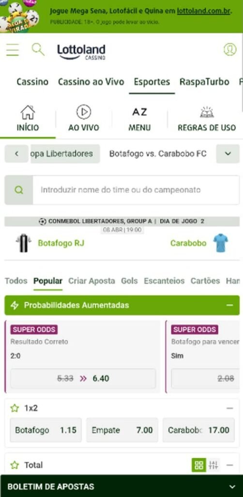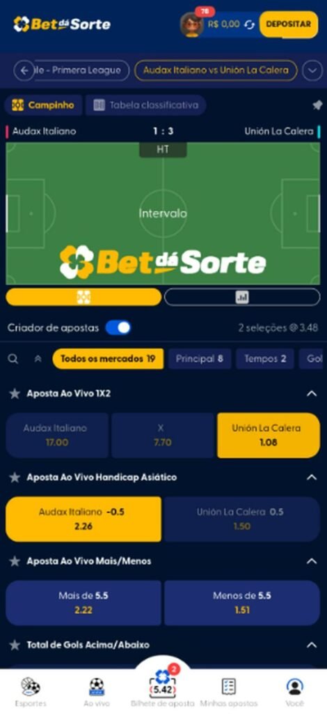 A plataforma bet oferece mercados pré-jogo e ao vivo com mercados como resultado final, handicap asiático, totais, escanteios, cartões e combinações via Criar Aposta (Bet Builder). Entre os recursos da plataforma estão SuperOdds em partidas selecionadas, Empate Anula, Múltipla Protegida e 2 Gols de Vantagem (liquidação antecipada em cenários específicos).