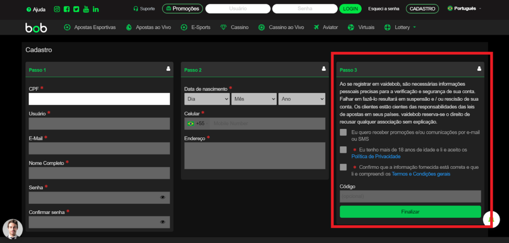 Foque em seu cadastrar e, por fim, realize o seu 1º depósito para poder fazer suas Vai de Bob apostas esportivas.